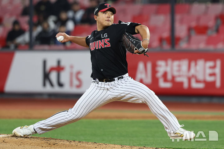 [수원=뉴시스] 추상철 기자 = 2일 오후 경기 수원 케이티위즈파크에서 열린 2025 KBO리그 LG트윈스와 kt 위즈의 경기, 1회말 2아웃에 교체 투입된 LG 투수 이지강이 역투하고 있다. 2025.04.02. [email protected]