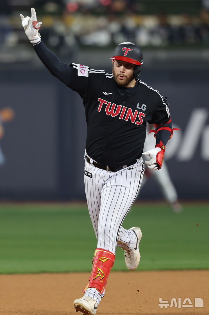 [수원=뉴시스] 추상철 기자 = 2일 오후 경기 수원 케이티위즈파크에서 열린 2025 KBO리그 LG트윈스와 kt 위즈의 경기, 3회초 2아웃 주자 없는 상황에서 LG 오스틴이 홈런을 때린 후 기뻐하고 있다. 2025.04.02. [email protected]