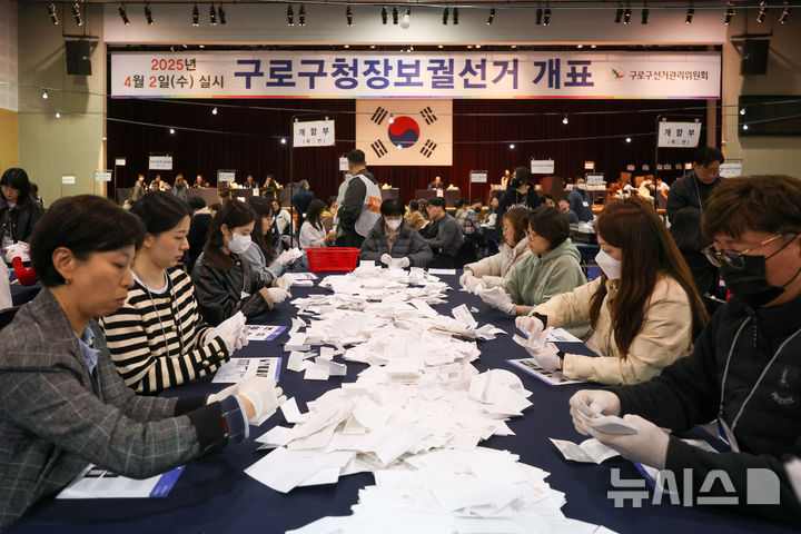 [서울=뉴시스] 김선웅 기자 = 2일 서울 구로구 동양미래대학교 대강당에 설치된 구로구청장 보궐선거 개표소에서 개표가 진행되고 있다. 2025.04.02. [email protected]