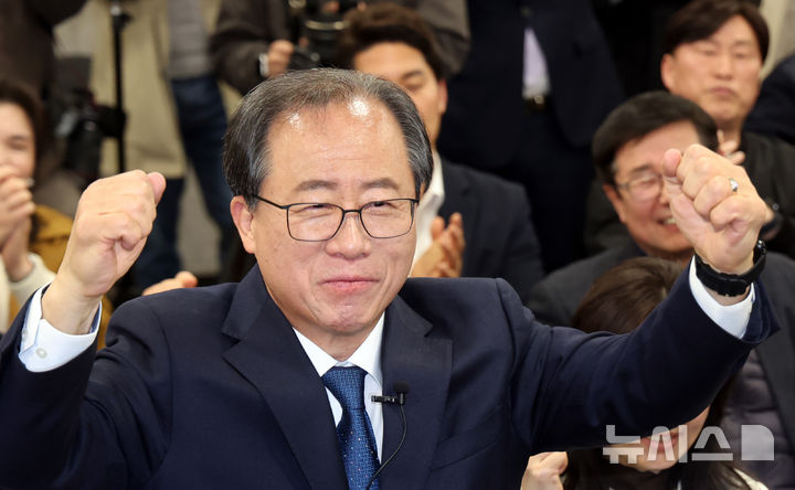 [부산=뉴시스] 하경민 기자 = 부산교육감 재선거 투표일인 2일 부산 부산진구 김석준 후보 선거사무소에서 김 후보가 당선이 유력해지자 손을 들고 지지자들에게 인사하고 있다. 2025.04.02. [email protected]