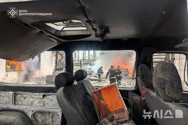 [크리비리흐=AP/뉴시스] 2일(현지 시간) 우크라이나 크리비리흐에서 소방관들이 러시아의 미사일 공격으로 발생한 화재를 진압하고 있다. 크리비리흐는 볼로디미르 젤렌스키 대통령의 고향이기도 하다. 2025.04.03.