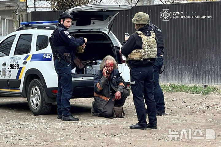 [크리비리흐=AP/뉴시스] 2일(현지 시간) 우크라이나 크리비리흐에서 러시아의 미사일 공격으로 다친 주민이 땅바닥에 앉아 전화 통화를 하고 있다. 크리비리흐는 볼로디미르 젤렌스키 대통령의 고향이기도 하다. 2025.04.03.