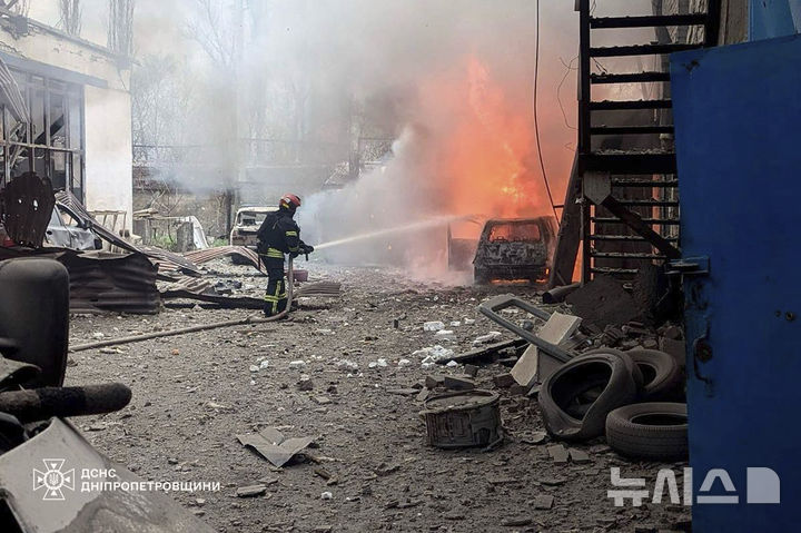 [크리비리흐=AP/뉴시스] 2일(현지 시간) 우크라이나 크리비리흐에서 한 소방관이 러시아의 미사일 공격으로 발생한 화재를 진압하고 있다. 크리비리흐는 볼로디미르 젤렌스키 대통령의 고향이기도 하다. 2025.04.03.