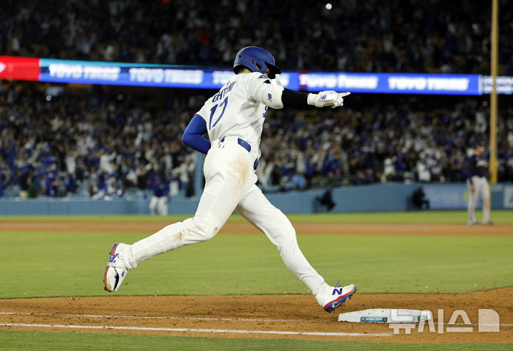 [로스앤젤레스=AP/뉴시스] LA 다저스의 오타니 쇼헤이가 2일(현지 시간) 미 캘리포니아주 로스앤젤레스의 다저스타디움에서 열린 2025 메이저리그 애틀랜타 브레이브스와의 경기 9회 말 끝내기 1점 홈런을 친 후 세리머니하며 베이스를 돌고 있다. 치고 들어오며 물세례를 받고 있다. 오타니는 5타수 3안타(1홈런) 1타점 1득점으로 팀의 6-5 승리를 이끌었고 다저스는 개막 8연승을 달렸다. 2025.04.03.