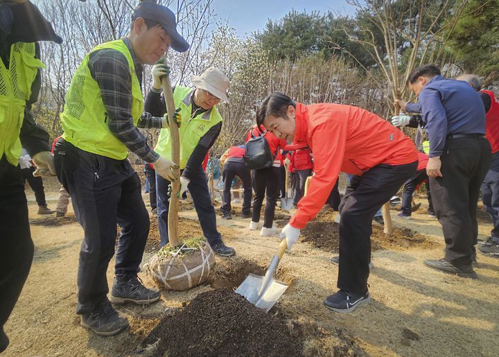 [서울=뉴시스] 전성수 서초구청장이 2일 서울 서초구 몽마르뜨 공원에서 식목일을 기념해 나무를 심고 있다. (사진=서초구 제공) 2025.04.03. [email protected] *재판매 및 DB 금지