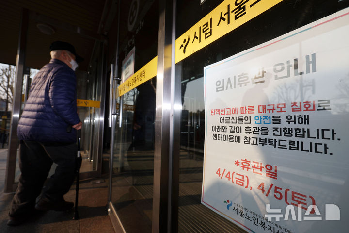 [서울=뉴시스] 홍효식 기자 = 윤석열 대통령의 탄핵 심판 선고를 하루 앞둔 3일 서울 종로구 헌법재판소 인근 시립서울노인복지센터 앞에 임시 휴관 안내문이 부착되어 있다. 2025.04.03. [email protected]
