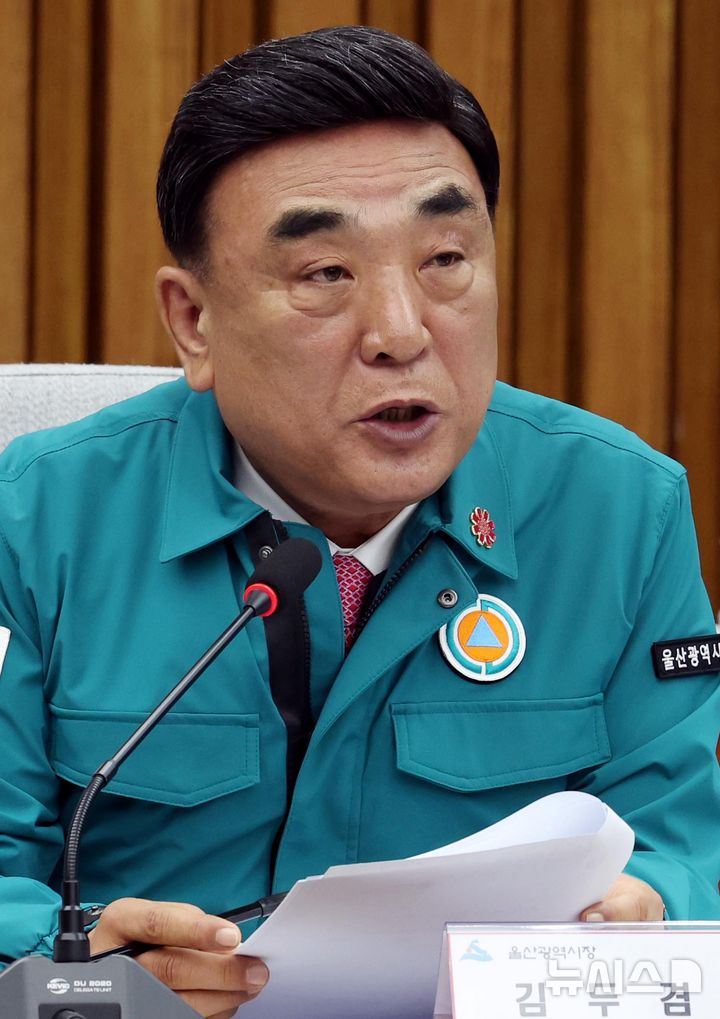 [서울=뉴시스] 조성봉 기자 = 김두겸 울산시장이 3일 오전 서울 여의도 국회에서 열린 산불피해 대책마련 당정협의회에서 발언을 하고 있다. 2025.04.03. [email protected]