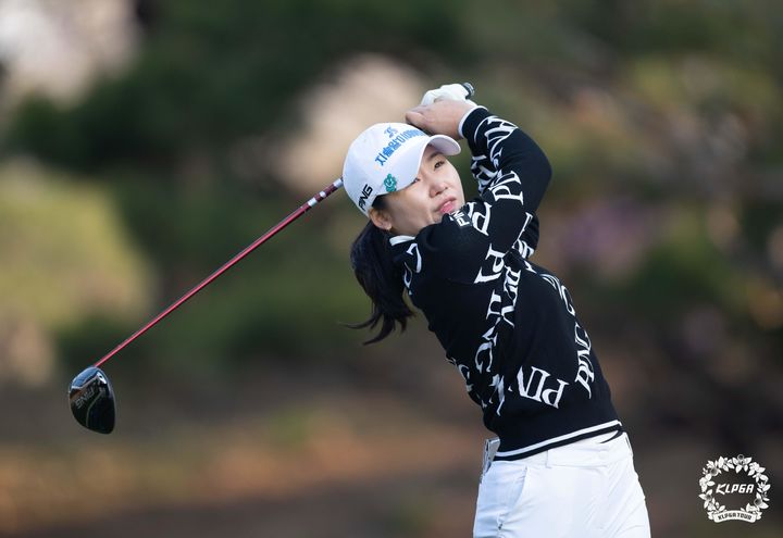 [서울=뉴시스] 3일 부산 동래베네스트CC에서 열린 두산건설 We've 챔피언십 1라운드 7번홀에서 오경은이 티샷을 하고 있다. (사진=KLPGA 제공) 2025.04.03. [email protected] *재판매 및 DB 금지