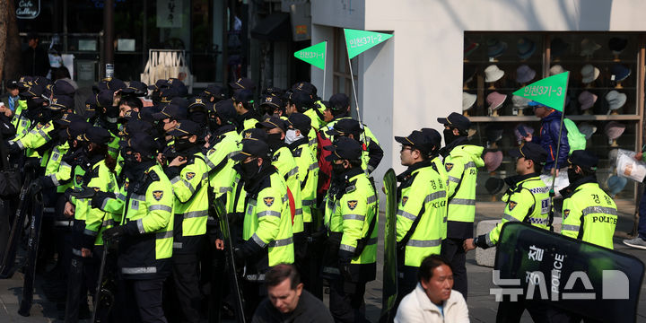 [서울=뉴시스] 홍효식 기자 = 윤석열 대통령 탄핵 심판 선고를 하루 앞두고 경찰이 서울에 을호비상을 발령한 3일 서울 종로구 헌법재판소 인근에서 인천 지역 경찰들이 동원돼 대기하고 있다. 2025.04.03. [email protected]