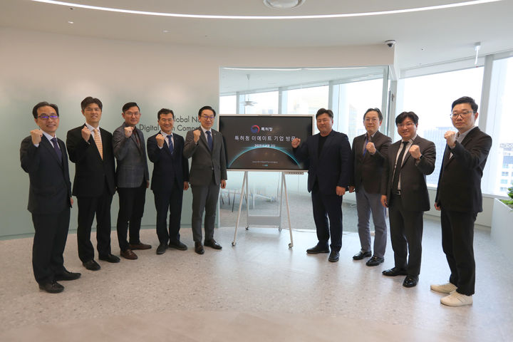 [서울=뉴시스] 황준선 기자 = 김완기 특허청장(왼쪽 다섯 번째)이 3일 서울 송파구 글로벌 IP스타기업 육성 지원을 받은 수출기업 이에이트를 방문해 참석자들과 기념촬영 하고 있다. (사진=특허청 제공) 2025.04.03. [email protected] *재판매 및 DB 금지