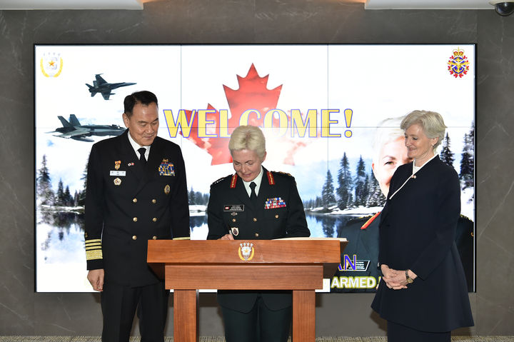 [서울=뉴시스] 황준선 기자 = 제니 캐리냥 캐나다 국방총장이 3일 오후 서울 용산구 국방부에서 열린 방한 환영 행사에서 방명록에 서명하고 있다. (사진=합동참모본부 제공) 2025.04.03. [email protected] *재판매 및 DB 금지
