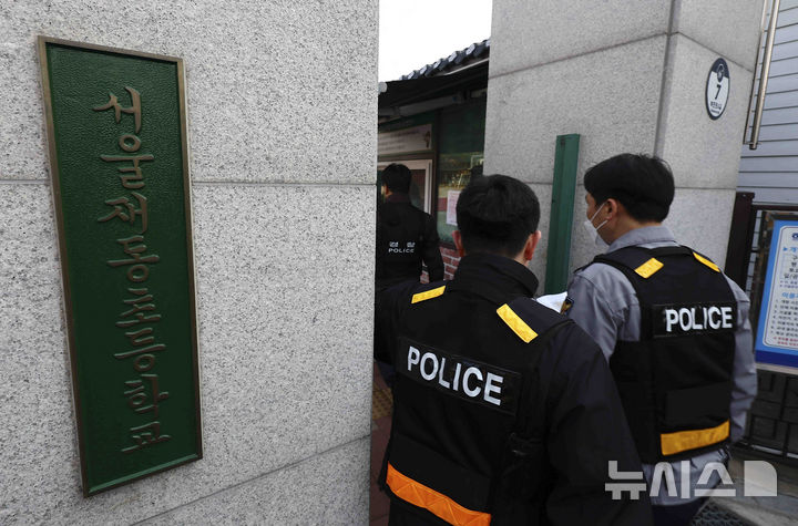 [서울=뉴시스] 김근수 기자 = 윤석열 대통령에 대한 탄핵심판 선고날인 4일 오전 서울 종로구 헌법재판소 인근 서울재동초등학교에 경찰들이 들어가고 있다. 2025.04.04. [email protected]