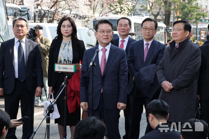 [서울=뉴시스] 사진공동취재단 = 윤석열 대통령 탄핵 심판 선고일인 4일 오전 서울 종로구 헌법재판소 앞에서윤석열 대통령의 법률대리인인 윤갑근 변호사가 발언하고 있다. 2025.04.04. [email protected]
