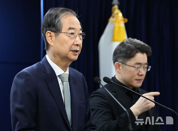 [서울=뉴시스] 최진석 기자 = 한덕수 대통령 권한대행 국무총리가 윤석열 대통령이 파면된 4일 서울 정부서울청사에서 대국민담화를 하고 있다. 2025.04.04. [email protected]