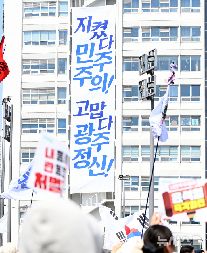 [광주=뉴시스] 김혜인 기자 = 헌법재판소가 윤석열 대통령 탄핵 인용 결정을 발표한 4일 오전 광주 동구 전일빌딩245에 파면 환영 현수막이 걸려있다. 2025.04.04. [email protected]