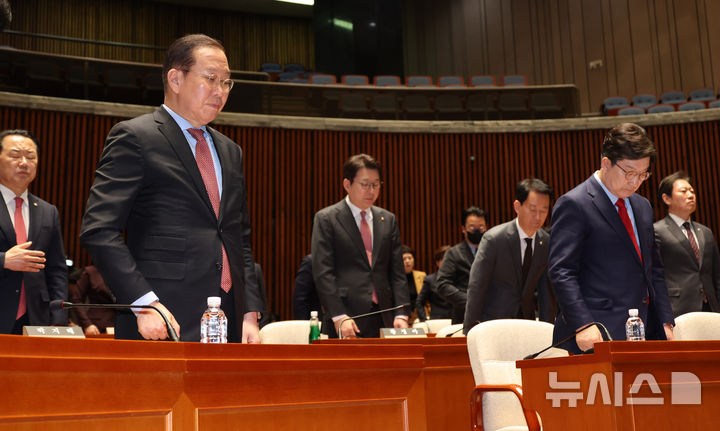 [서울=뉴시스] 조성우 기자 = 권영세(왼쪽) 국민의힘 비상대책위원장과 권성동 원내대표가 윤석열 전 대통령이 파면된 4일 오전 서울 여의도 국회에서 열린 의원총회에서 국기에 대한 경례를 한 뒤 자리에 앉고 있다. 2025.04.04. [email protected]