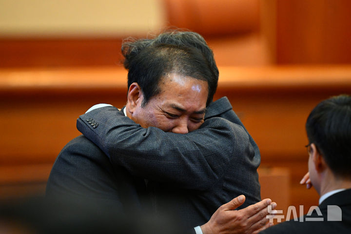 [서울=뉴시스] 사진공동취재단 = 장순욱 국회측 변호인이 4일 오전 서울 종로구 헌법재판소 대심판정에서 열린 윤석열 대통령 탄핵심판 인용이 결정 된 뒤 관계자와 안고 있다. 2025.04.04. [email protected]
