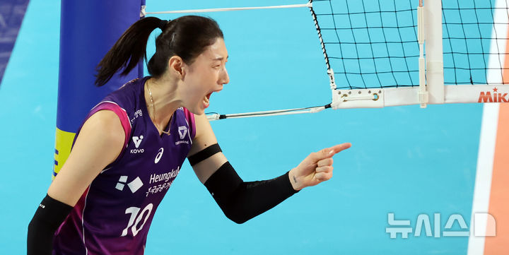[대전=뉴시스] 강종민 기자 = 4일 대전 충무체육관에서 열린 2024~2025 V-리그 여자부 챔피언결정전 흥국생명 핑크스파이더스와 정관장 레드스파크스의 경기에서 흥국생명 김연경이 득점한 후 포효하고 있다. 2025.04.04. [email protected]