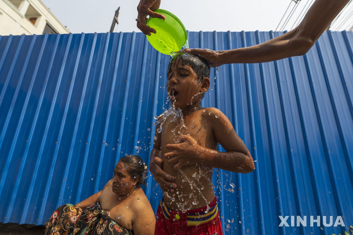 [만달레이=신화/뉴시스] 4일(현지 시간) 미얀마 만달레이의 이재민 대피소에서 한 아이가 물로 더위를 식히고 있다. 미얀마 공식 언론 미얀마 라디오 텔레비전은 지난달 28일 발생한 규모 7.7의 강진으로 현재까지 3301명이 숨지고 4792명이 다쳤으며, 221명이 실종됐다고 보도했다. 2025.04.05.