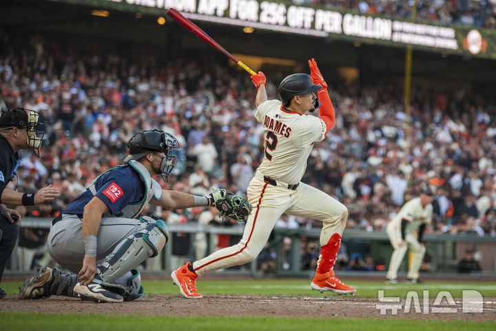 [샌프란시스코=AP/뉴시스] 샌프란시스코 자이언츠의 윌리 아다메스가 4일(현지 시간) 미 캘리포니아주 샌프란시스코의 오라클 파크에서 열린 2025 메이저리그 시애틀 매리너스와의 경기 연장 11회 말 끝내기 적시타를 치고 있다. 아다메스는 팀이 8-9로 끌려가던 11회 말 2사 2, 3루 상황에서 끝내기 2타점 적시타로 10-9 승리를 이끌었다. 2025.04.05.