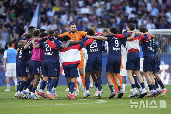 [파리=AP/뉴시스] 파리 생제르맹(PSG) 선수들이 5일(현지 시간) 프랑스 파리의 파르크 데 프랭스에서 열린 2024-25 리그1 앙제와의 경기에서 승리, 리그 우승을 확정한 후 자축하고 있다. 이강인이 결장한 PSG는 앙제를 1-0으로 물리치고 잔여 경기 결과에 상관없이 우승을 확정했다. 2025.04.06.