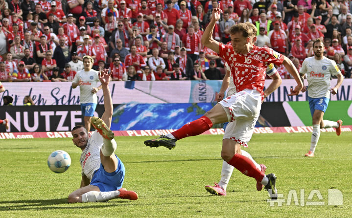 [마인츠=AP/뉴시스] 마인츠05의 넬슨 바이퍼가 5일(현지 시간) 독일 마인츠의 메바 아레나에서 열린 2024-25 분데스리가 28라운드 홀슈타인 킬과 경기 후반 30분 동점 골을 넣고 있다. 이재성은 친정팀을 상대로 68분을 뛰었고 마인츠는 킬과 1-1 무승부를 기록해 리그 4위를 유지했다. 2025.04.06.