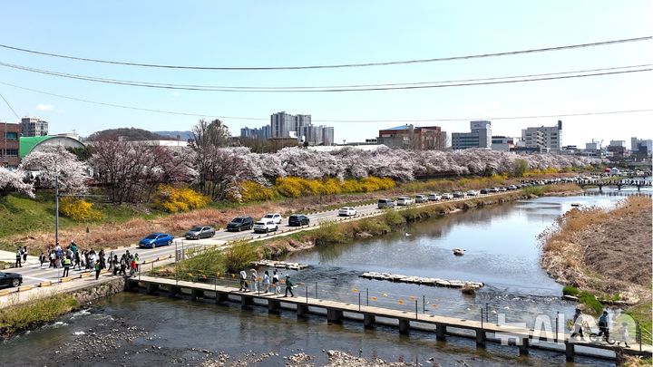 [청주=뉴시스] 연종영 기자 = 6일 오전 충북 청주시 도심을 가로지르는 무심천 양쪽 무심동로와 무심서로에서 시민들이 만개한 벚꽃을 감상하고 있다. 이날 무심천 일원에선 푸드트럭 축제, 청주예술제 등이 열렸다. 2025.04.06. [email protected]