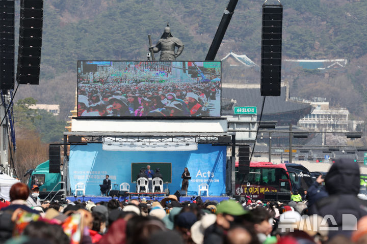 [서울=뉴시스] 김명원 기자 = 6일 오전 서울 종로구 세종대로 동화면세점~코리아나호텔 앞 편도 전 차로에서 사랑제일교회의 전국 주일 연합 예배가 진행되고 있다. 2025.04.06. [email protected]