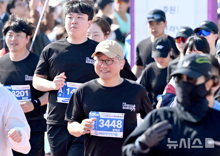 [광주=뉴시스] 김혜인 기자 = '제11회 나주영산강마라톤대회'가 열린 6일 오전 전남 나주시 나주종합스포츠파크에서 조덕선 SRB미디어그룹 회장이 마라톤 대회에 참여해 달리고 있다. 나주영산강마라톤대회는 뉴시스광주전남본부·엠디에스앤씨가 주최하고 나주마라톤동호회가 주관했다. 2025.04.06. [email protected]