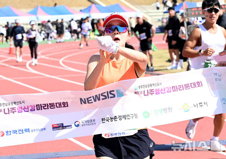 [광주=뉴시스] 김혜인 기자 = '제11회 나주영산강마라톤대회'가 열린 6일 오전 전남 나주시 나주종합스포츠파크에서 하프코스 여자 1위 김귀덕씨가 결승선을 통과하고 있다. 영산강마라톤대회는 뉴시스광주전남본부·엠디에스앤씨가 주최하고 나주마라톤동호회가 주관했다. 2025.04.06. [email protected]