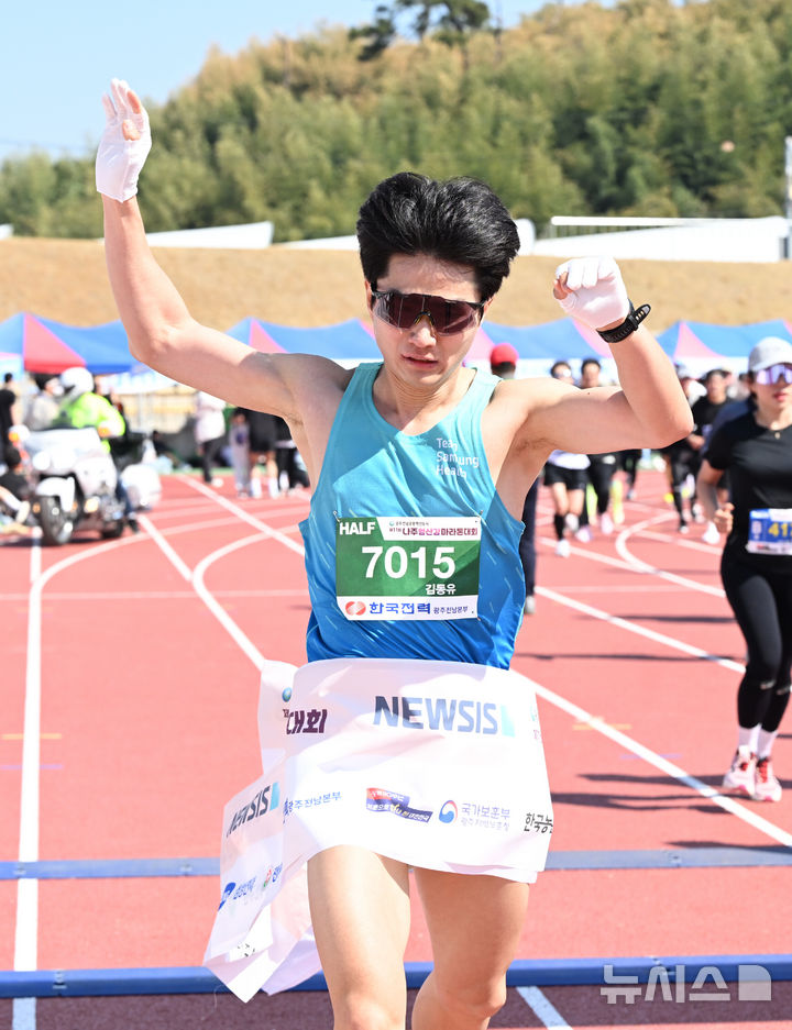 [광주=뉴시스] 김혜인 기자 = '제11회 나주영산강마라톤대회'가 열린 6일 오전 전남 나주시 나주종합스포츠파크에서 하프코스 남자 1위 김동유씨가 결승선을 통과하고 있다. 영산강마라톤대회는 뉴시스광주전남본부·엠디에스앤씨가 주최하고 나주마라톤동호회가 주관했다. 2025.04.06. [email protected]