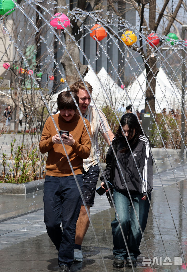 [서울=뉴시스] 이영환 기자 = 비가 그치고 따뜻한 날씨를 보인 6일 오후 서울 종로구 광화문광장 분수에서 관광객들이 즐거운 시간을 보내고 있다. 2025.04.06. [email protected]