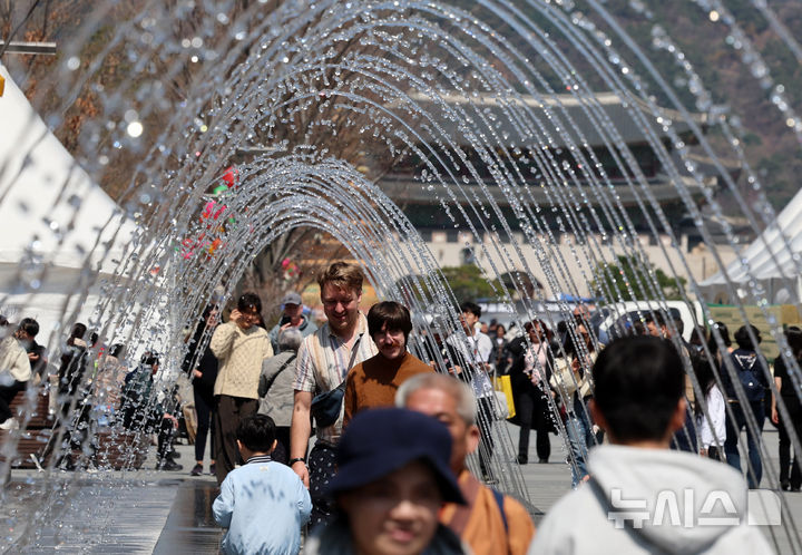 [서울=뉴시스] 이영환 기자 = 비가 그치고 따뜻한 날씨를 보인 6일 오후 서울 종로구 광화문광장 분수에서 관광객들이 즐거운 시간을 보내고 있다. 2025.04.06. [email protected]