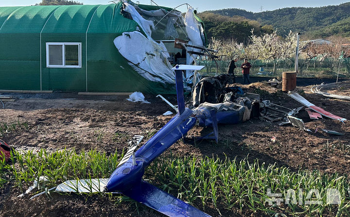 [대구=뉴시스] 김정화 기자 = 6일 오후 3시41분께 대구 북구 서변동 일대 야산에서 산불을 진화하던 헬기가 추락해 있다. 2025.04.06. [email protected]