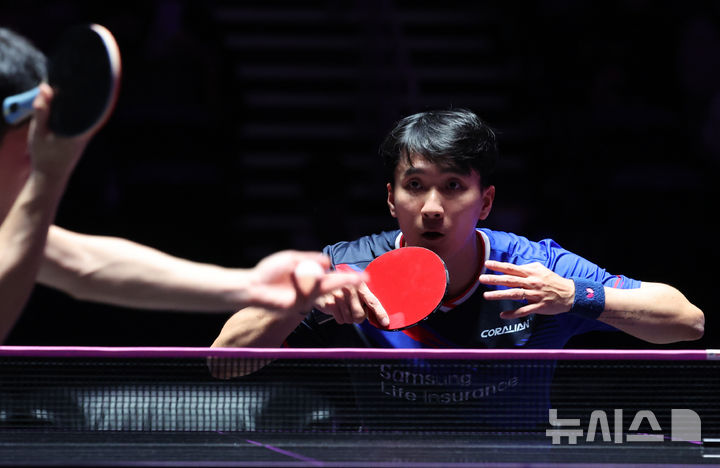 [인천=뉴시스] 전진환 기자 = 6일 인천 중구 인스파이어 아레나에서 열린 WTT(월드테이블테니스) 챔피언스 인천 2025 대회에서 이상수(대한민국)가 샹펭(중국)을 상대로 남자 단식 결승 경기를 펼치고 있다. 2025.04.06. [email protected]