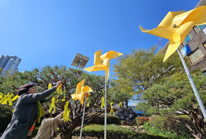 [광주=뉴시스] 박기웅 기자 = 7일 오전 광주 북구 인권교육과 직원들이 세월호 참사 11주기를 앞두고 북구청 광장 화단에 노란 리본과 바람개비를 설치하고 있다. 북구는 세월호 참사일인 오는 16일까지 추모 주간을 운영할 계획이다. (사진 = 광주 북구 제공) 2025.04.07. [email protected]