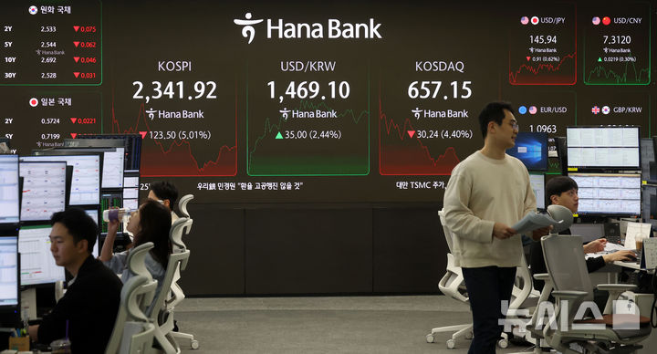[서울=뉴시스] 홍효식 기자 = 코스피가 전 거래일(2465.42)보다 106.17포인트(4.31%) 급락한 2359.25에 개장한 7일 오전 서울 중구 하나은행 딜링룸 전광판에 지수가 표시되고 있다.
