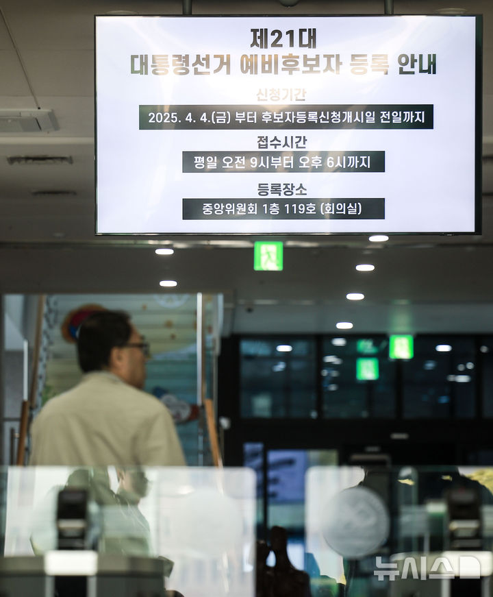 [과천=뉴시스] 정병혁 기자 = 윤석열 전 대통령 파면으로 조기대선 준비가 착수된 가운데 7일 경기 과천시 중앙선거관리위원회에 21대 대통령 선거 예비후보자 등록 안내문이 나오고 있다. 2025.04.07. [email protected]