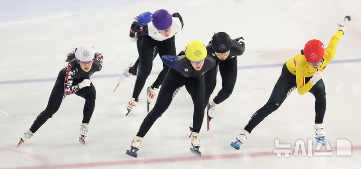 [서울=뉴시스] 김금보 기자 = 7일 서울 양천구 목동아이스링크에서 열린 2025/26시즌 쇼트트랙 국가대표 1차 선발대회 여자 1500m 준준결승 5조, 최지현(노, 전북도청)과 박지윤(흰, 서울시청)이 역주하고 있다. 2025.04.07. [email protected]