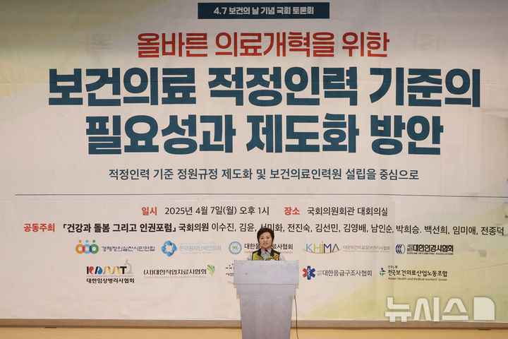 [서울=뉴시스] 권창회 기자 = 최희선 보건의료노조 위원장이 7일 오후 서울 여의도 국회 의원회관에서 열린 4.7 보건의날 기념 국회 토론회에서 인사말을 하고 있다. 2025.04.07. [email protected]