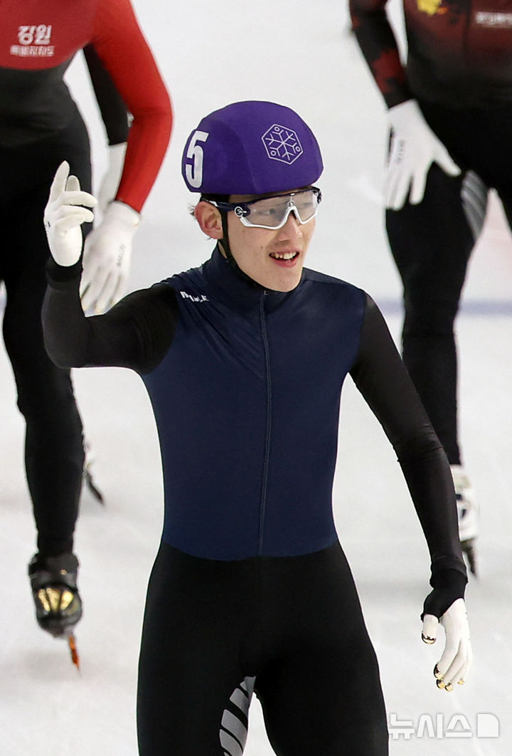 [서울=뉴시스] 김금보 기자 = 7일 서울 양천구 목동아이스링크에서 열린 2025/26시즌 쇼트트랙 국가대표 1차 선발대회 남자 1500m 결승, 임종언(보, 노원고)이 1위로 결승선을 통과한 뒤 기뻐하고 있다. 2025.04.07. [email protected]