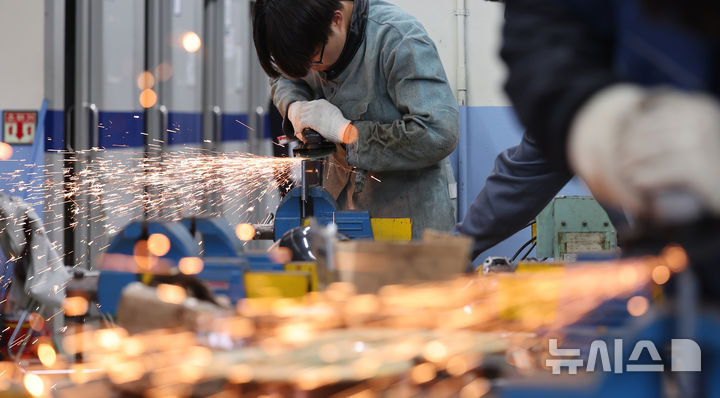 [인천=뉴시스] 전진환 기자 = 7일 오후 인천 미추홀구 인천소방고등학교에서 열린 2025년 인천기능경기대회 용접부문에 출전한 선수들이 금속 구조물 표면을 다듬고 있다. 2025.04.07. [email protected]