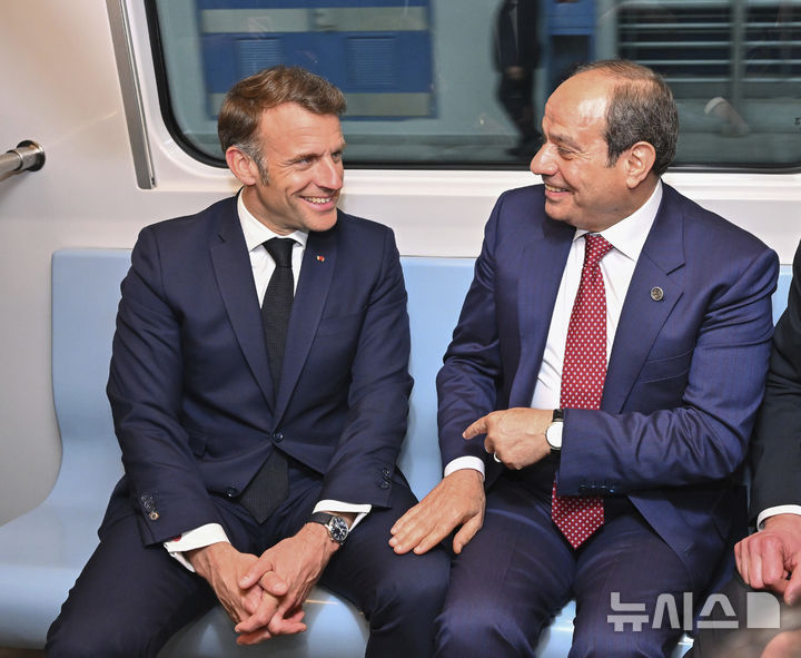 [카이로=AP/뉴시스] 이집트 대통령실이 제공한 사진에 7일(현지 시간) 압델 파타 엘시시(오른쪽) 이집트 대통령과 에마뉘엘 마크롱 프랑스 대통령이 카이로에서 프랑스 RATP 그룹이 운영하는 메트로 노선 지하철에 탑승해 얘기를 나누고 있다. 2025.04.08.