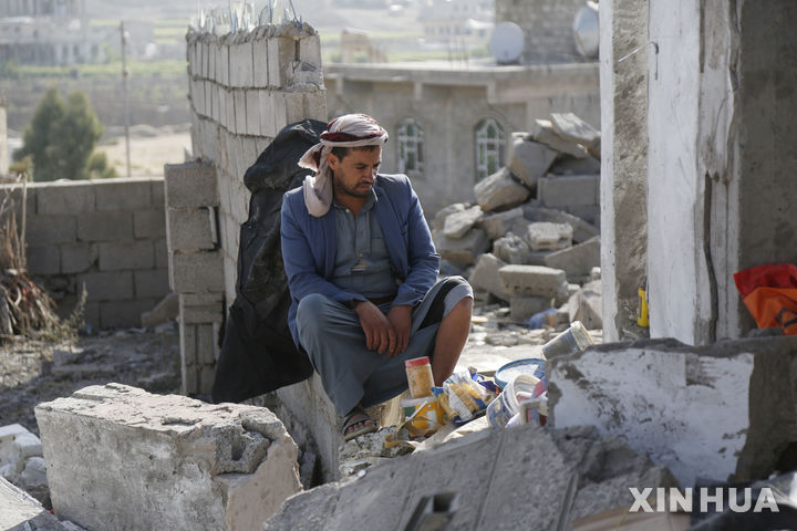 [사나=신화/뉴시스] 7일(현지 시간) 예멘 사나에서 한 주민이 미군 공습으로 파괴된 집 잔해에 넋이 나간 듯 앉아 있다. 현지 당국은 지난 6일 저녁 미군의 주택가 폭격으로 4명이 숨지고 어린이 포함 23명이 다쳤다고 밝혔다. 2025.04.08.