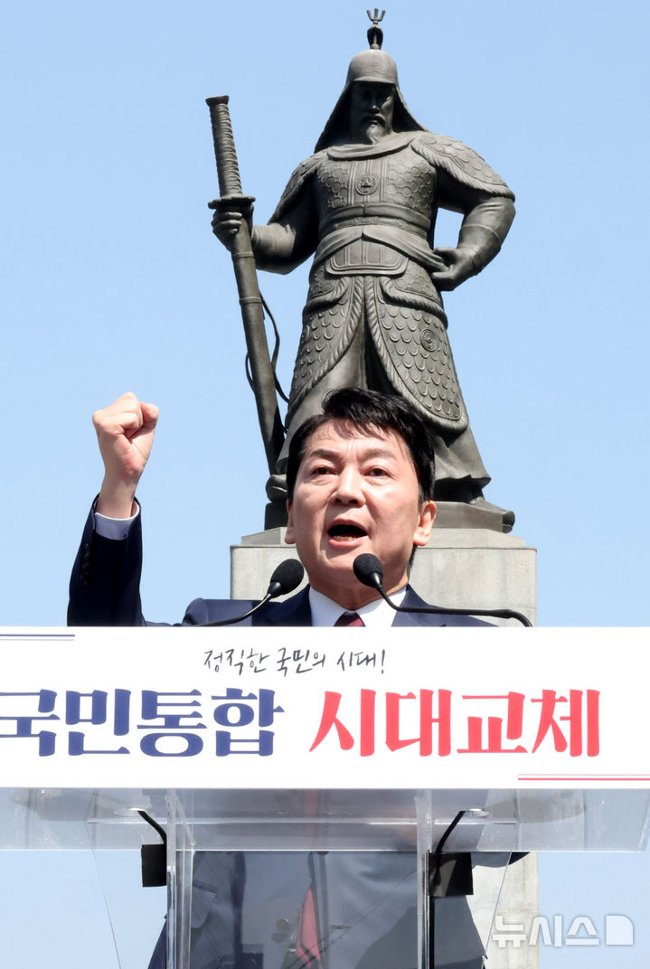 [서울=뉴시스] 추상철 기자 = 안철수 국민의힘 의원이 8일 오전 서울 종로구 광화문광장 이순신동상 앞에서 제21대 대통령 선거 출마 기자회견을 하고 있다. 2025.04.08. [email protected]