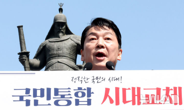 [서울=뉴시스] 추상철 기자 = 안철수 국민의힘 의원이 8일 오전 서울 종로구 광화문광장 이순신동상 앞에서 제21대 대통령 선거 출마 기자회견을 열고 발언하고 있다. 2025.04.08. [email protected]