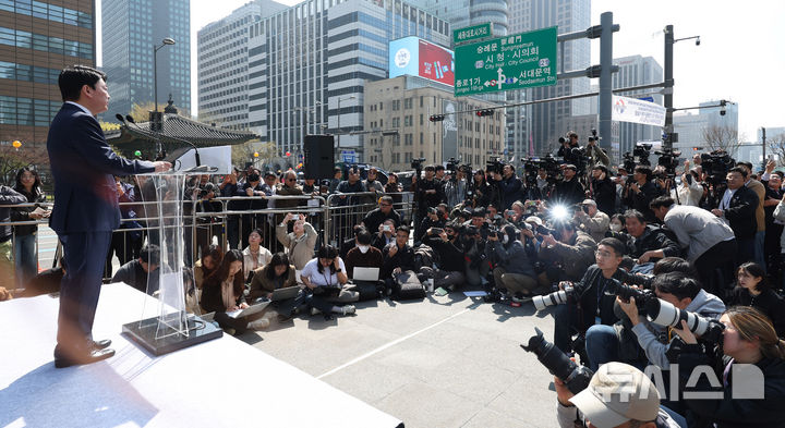 [서울=뉴시스] 추상철 기자 = 안철수 국민의힘 의원이 8일 오전 서울 종로구 광화문광장 이순신동상 앞에서 제21대 대통령 선거 출마 기자회견을 하고 있다. 2025.04.08. [email protected]