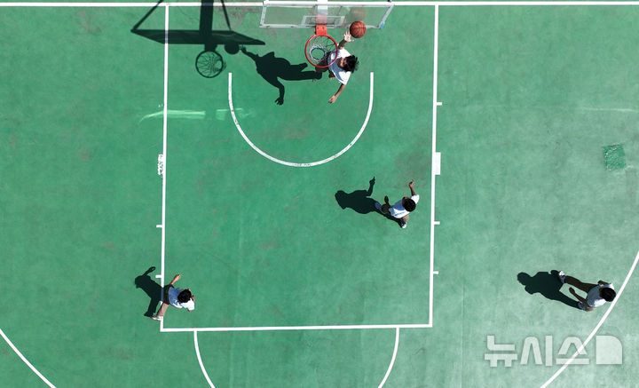 [대구=뉴시스] 이무열 기자 = 대구 낮 최고기온이 24도까지 오르며 초여름 날씨를 보인 8일 대구 동구 대구공업고등학교 농구장에서 반팔 티셔츠를 입은 학생들이 농구를 하고 있다. 2025.04.08. [email protected]