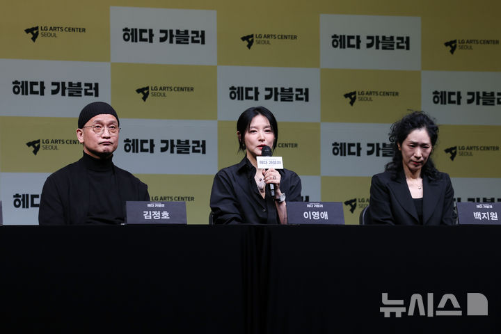 [서울=뉴시스] 박진희 기자 = 연극 '헤다 가블러' 배우 배우 김정호, 이영애, 백지원이 8일 서울 강서구 LG아트센터에서 기자간담회를 하고 있다. 2025.04.08. [email protected]