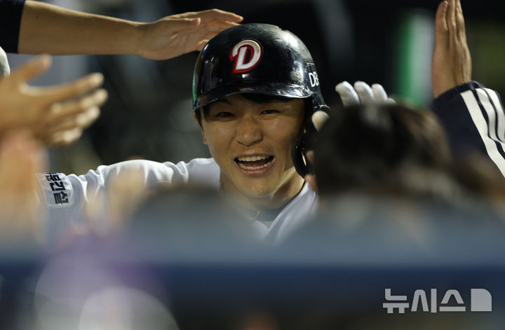 [서울=뉴시스] 고범준 기자 = 8일 서울 송파구 잠실야구장에서 열린 2025 KBO리그 한화 이글스와 두산 베어스의 경기, 4회말 2사 2루 두산 박계범이 안타를 치고 상대 실책으로 홈 베이스를 밟아 동료들의 축하를 받고 있다. 2025.04.08. [email protected]